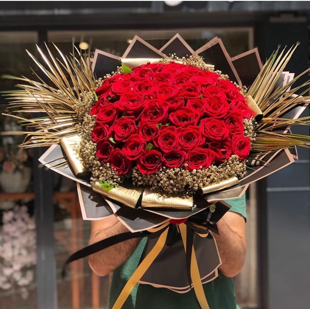 Görselde yer alan bu lüks tasarım; yoğun kırmızı güller, ışıltılı altın rengi yapraklar, doğal kuru çiçekler ve siyah ambalajla birleşerek güçlü bir ifade sunar. Aşkı, tutkuyu ve zarafeti aynı anda yansıtan bu çiçek, özel günleri unutulmaz kılmak isteyenler için idealdir.