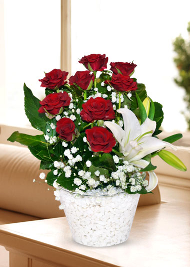 Konik vazo içerisinde Kırmızı güller ve beyaz lilyum ile hazırlanan akşam güneşi aranjmanı ciceksurprizi.com'da.