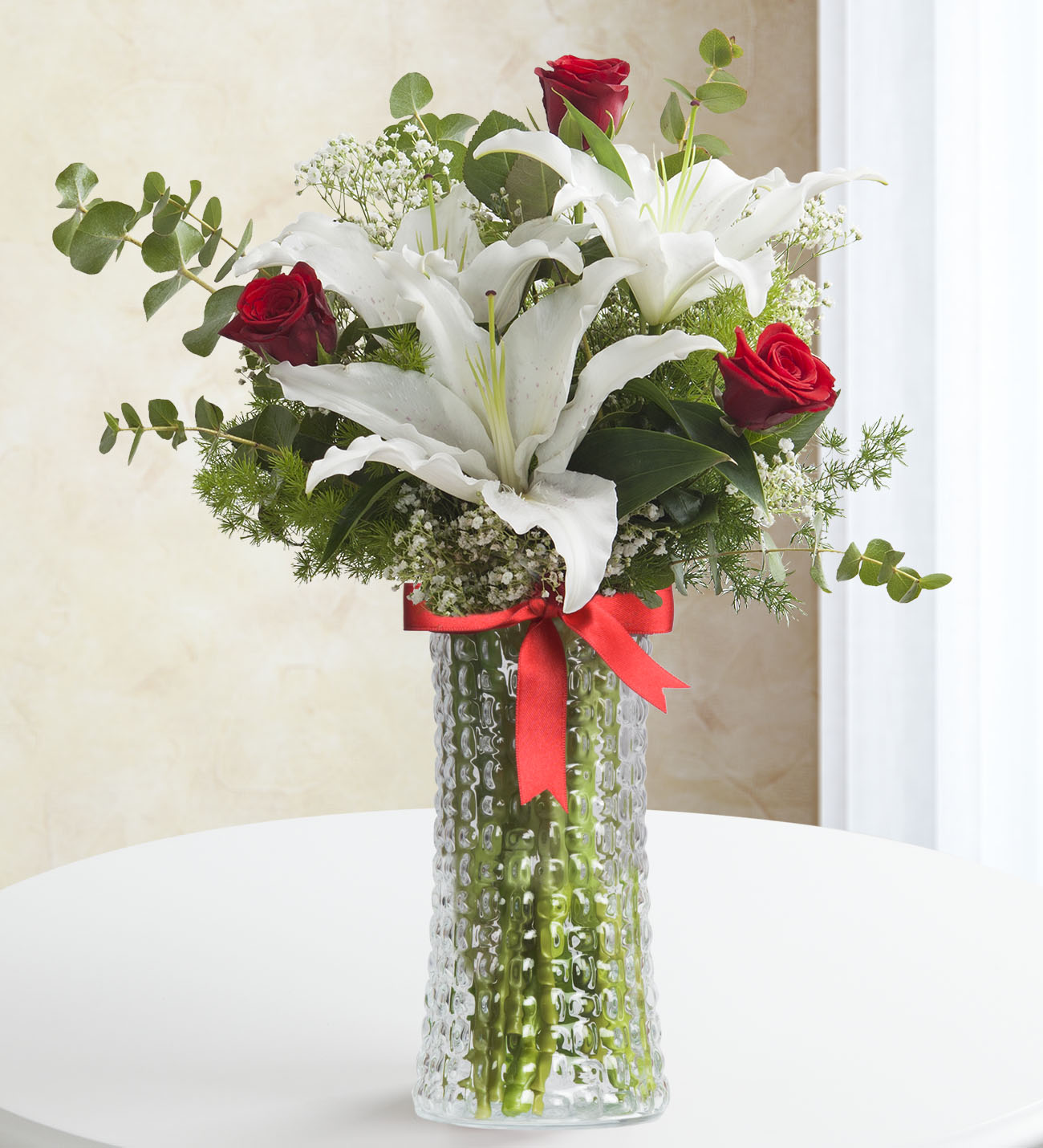 Bir düş kadar güzel olan sevginizi ifade etmeye kelimeler yetmiyorsa, bu özel çiçek aşkınızı ilan etmeniz için en büyük yardımcınız olacak. Cam vazoda cipso ve yeşilliklerle süslenmiş 3 adet kırmızı gül ve 3 adet beyaz lilyumdan oluşan gül ve lilyum çiçek aranjmanı ile ona asla unutamayacağı romantik bir jest yapın.