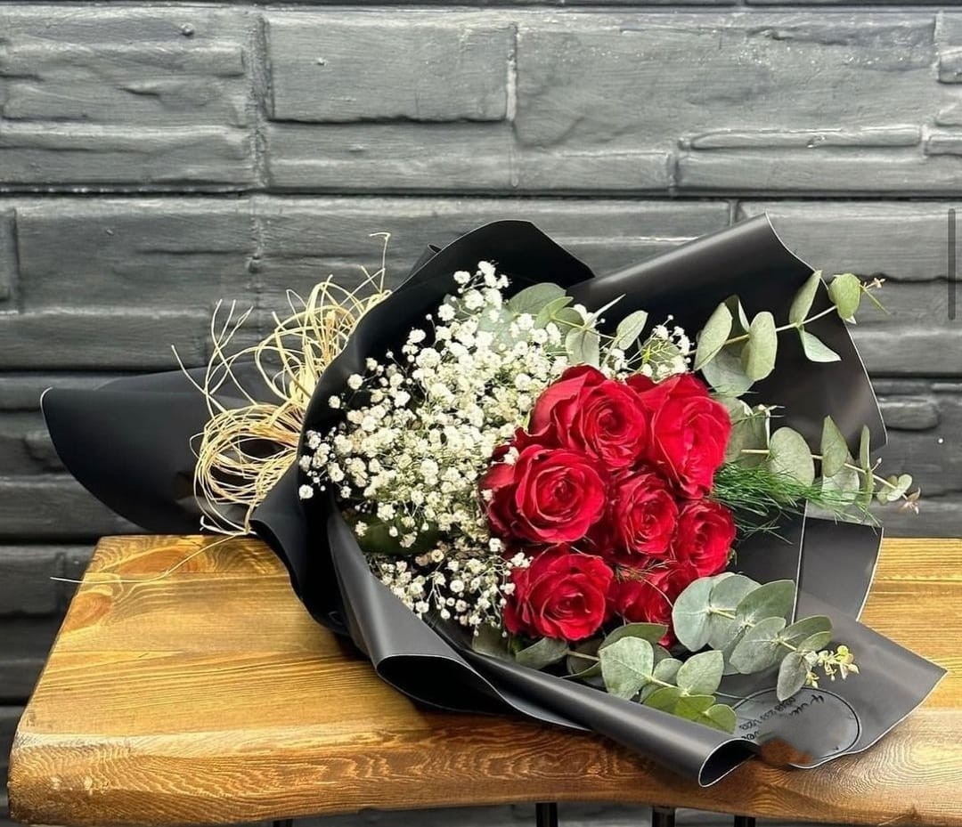 Bu buketteki canlı kırmızı güller, cipso çiçekleri ve okaliptüs yapraklarıyla dengelenmiş; mat siyah ambalajla modern ve asil bir görünüm kazanmıştır.