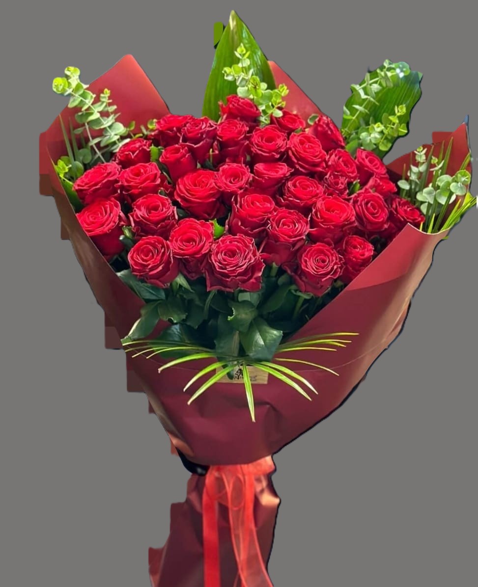 Urfa Edalı Çiçek, görselde yer alan bu göz alıcı kırmızı gül buketi ile duygularınıza zarif ve etkileyici bir ifade kazandırıyor. Kırmızı saten kurdeleyle bağlanmış, bordo ambalaj içinde sunulan bu özel buket; romantik anlara anlam katmak için tasarlandı.