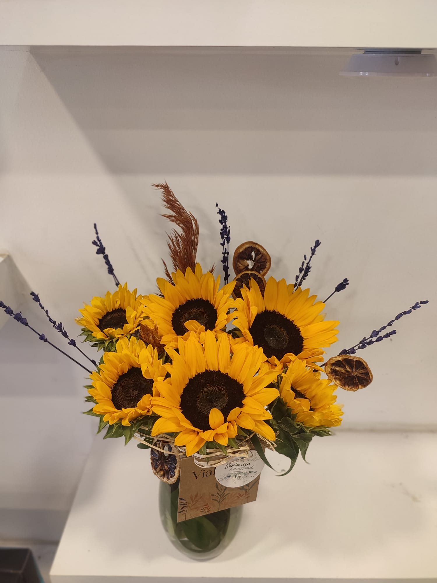 Cam vazo, sade ve zarif yapısıyla ayçiçeklerinin gösterişli duruşunu tamamlıyor. Aranjmana lavanta dalları, kuru narenciye dilimleri ve doğal kurutulmuş bitkiler eşlik ediyor. Bu sayede çiçekler yalnızca güzel görünmekle kalmaz; aynı zamanda hoş bir koku ve rustik bir hava da sunar.