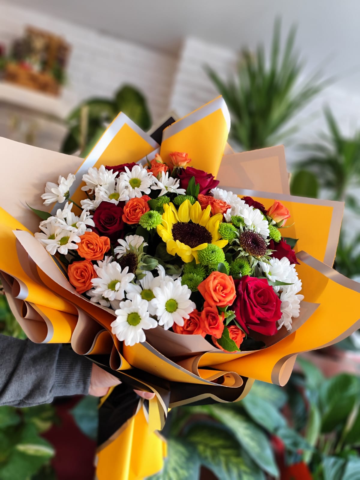 Günebakanın sıcaklığı, kırmızı güllerin zarafeti, turuncu güllerin enerjisi ve papatyaların sade güzelliği bir araya gelerek büyüleyici bir buket oluşturuyor.