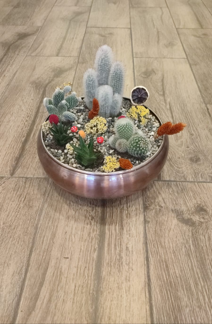 Farklı türlerde kaktüsler ve sukulentler kullanılarak hazırlanan bu özel aranjman, bakır renkli yuvarlak metal saksı içinde sunulmakta ve çakıl taşları, kuru çiçekler, yapay mantarlar ve minik doğal aksesuarlarla zenginleştirilmiştir.
