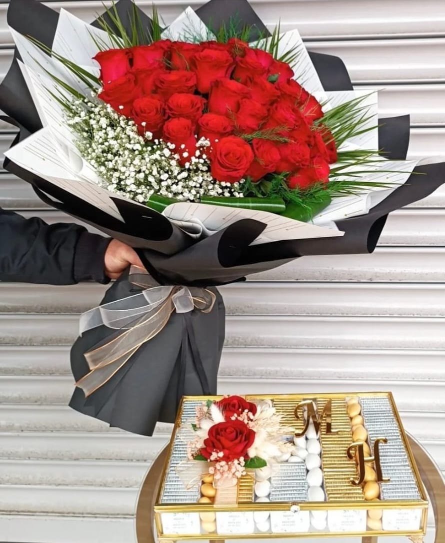 Canlı ve taptaze kırmızı güller, cipso ve yeşil detaylarla süslenmiş zarif bir buket haline getirilirken, yanındaki kişiye özel hazırlanmış çikolata kutusu altın detayları ve isim harfleriyle göz kamaştırır. Bu set; sevgiliye, eşe, nişanlıya ya da çok özel bir dosta sunulabilecek anlamlı ve unutulmaz bir hediyedir.