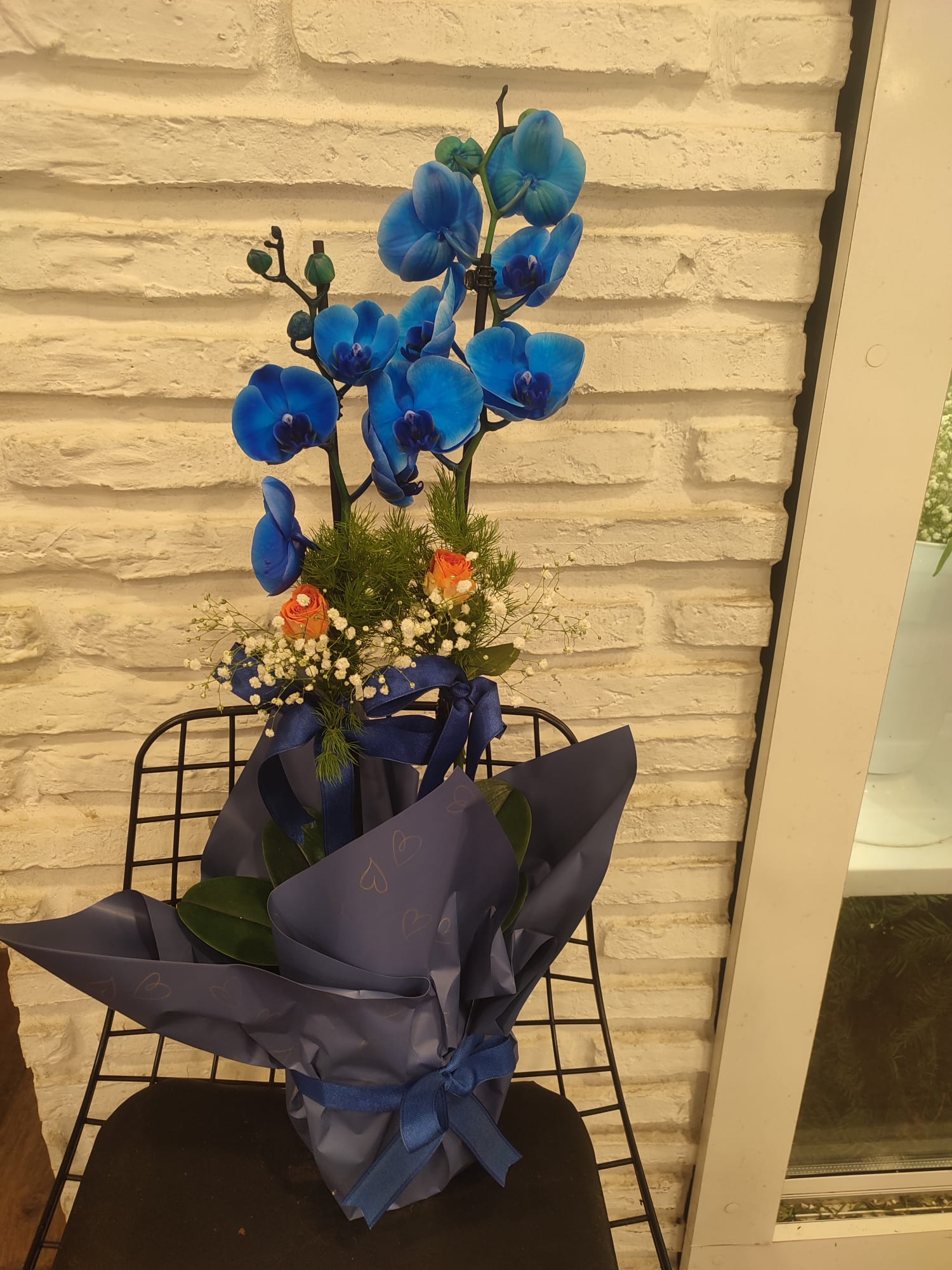 Modern ve estetik mavi saten kâğıtla kaplanmış saksısı, uyumlu kurdele detayı ve eşlik eden minik beyaz çiçekler ile orkideye sanatsal bir dokunuş katıyor. Özel günlerinizde sevdiklerinize benzersiz bir jest yapmak için tercih edebileceğiniz bu aranjman; doğum gününden yıldönümüne, yeni iş tebriğinden sevgililer gününe kadar her anı unutulmaz kılmak için hazırlandı.