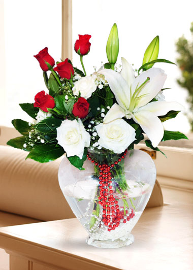 Kalp vazo içerisinde kırmızı gül, beyaz lilyum çiçekleri ve beyaz güller ile hazırlanan mutlu masal aranjmanı ile sevdiklerinize çok güzel bir çiçek siparişi verebilirsiniz.