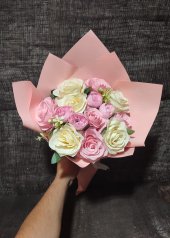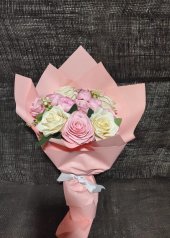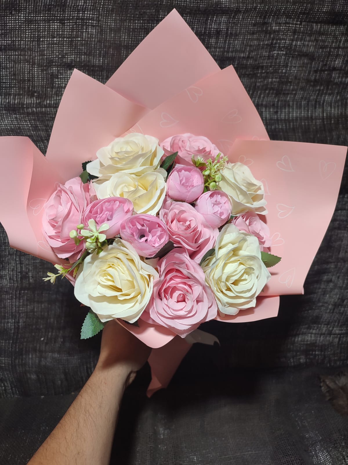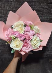 Masumiyetin ve sevginin renkleriyle hazırlanmış bu özel buket, yumuşak pembe ve krem tonlarındaki güllerin zarafetini bir araya getiriyor.