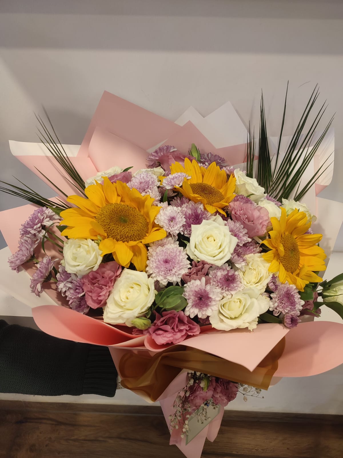 Urfa Edalı Çiçek’in özenle hazırladığı Ayçiçeği, Beyaz Gül ve Mor Krizantem Buketi, doğanın canlılığını ve duygularınızın samimiyetini bir araya getiriyor. Sarının enerjisiyle güneş gibi parlayan ayçiçekleri, zarif beyaz güller ve romantik pembe-mor tonlarındaki lisyantus ve krizantemlerle hazırlanmış bu buket; hem göz alıcı hem de çok anlamlı.