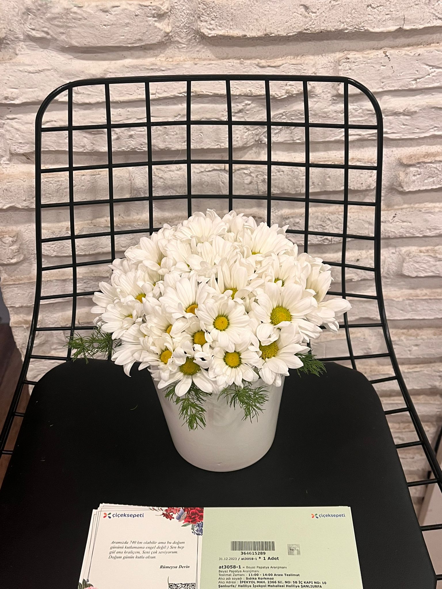 Sadeliğin içindeki zarafet ve masumiyetin simgesi olan beyaz papatyalar, beyaz seramik saksı içerisinde özenle bir araya geldi. “Az ama anlamlı” diyenler için tasarlanmış bu şık aranjman, sevdiklerinize hem görsel bir mutluluk hem de içten bir mesaj taşır. Şanlıurfa’da sadelik ve huzuru anlatan bir çiçek arıyorsanız, tam size göre.