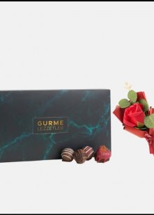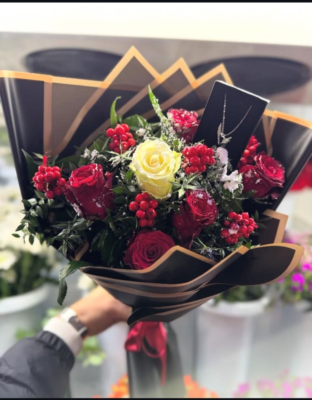 Güllerin arasına yerleştirilen kırmızı meyveli süs bitkileri (Hypericum) doğallığı artırırken, yapay kar detayları kış masalı havası katıyor. Siyah üzerine altın yaldızlı ambalaj tasarımı ise bu buketi sadece bir çiçek değil, aynı zamanda lüks bir hediye haline getiriyor. Üstelik içinde yer alan zarif kolye hediyesiyle sevdiğiniz kişiye kalıcı bir hatıra da sunmuş oluyorsunuz.